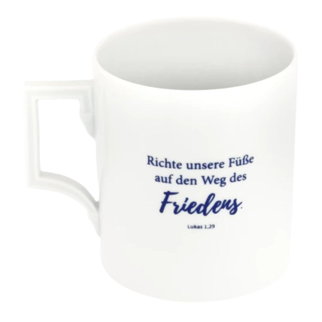 In enger Zusammenarbeit zwischen der Porzellanmanufaktur MEISSEN® und der Stiftung Frauenkirche Dresden wurde Nadine Wölks unverwechselbare Handschrift auf edles Porzellan übertragen – eine Verbindung aus künstlerischer Vision und jahrhundertealter Handwerkskunst. Auf der Rückseite findet sich der Bibelvers: „Leite unsere Füße auf den Weg des Friedens.“ (nach Lukas 1,79) – ein Spruch, der der Frauenkirche seit ihrem Wiederaufbau besondere Bedeutung verleiht.