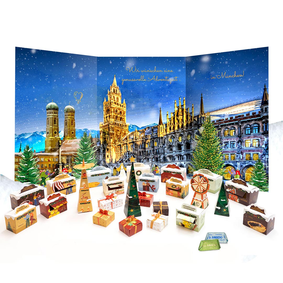 Ein toller Adventskalender als Schokoladenmarkt vor der Münchner-Stadt-Silhouette.