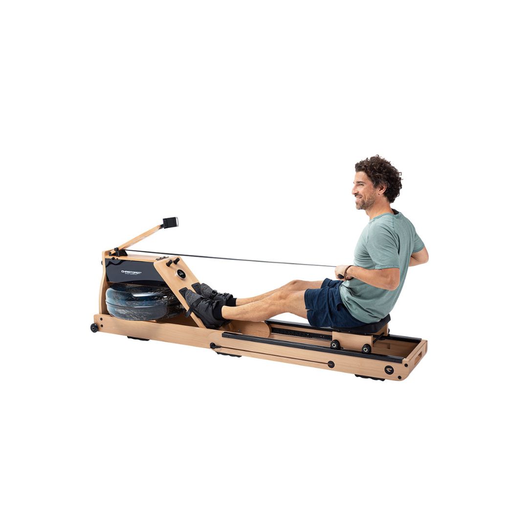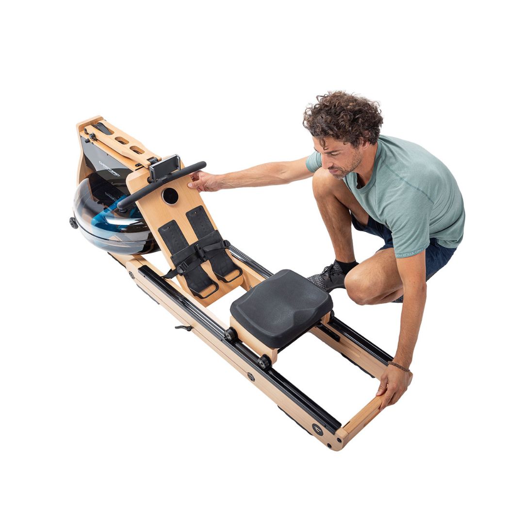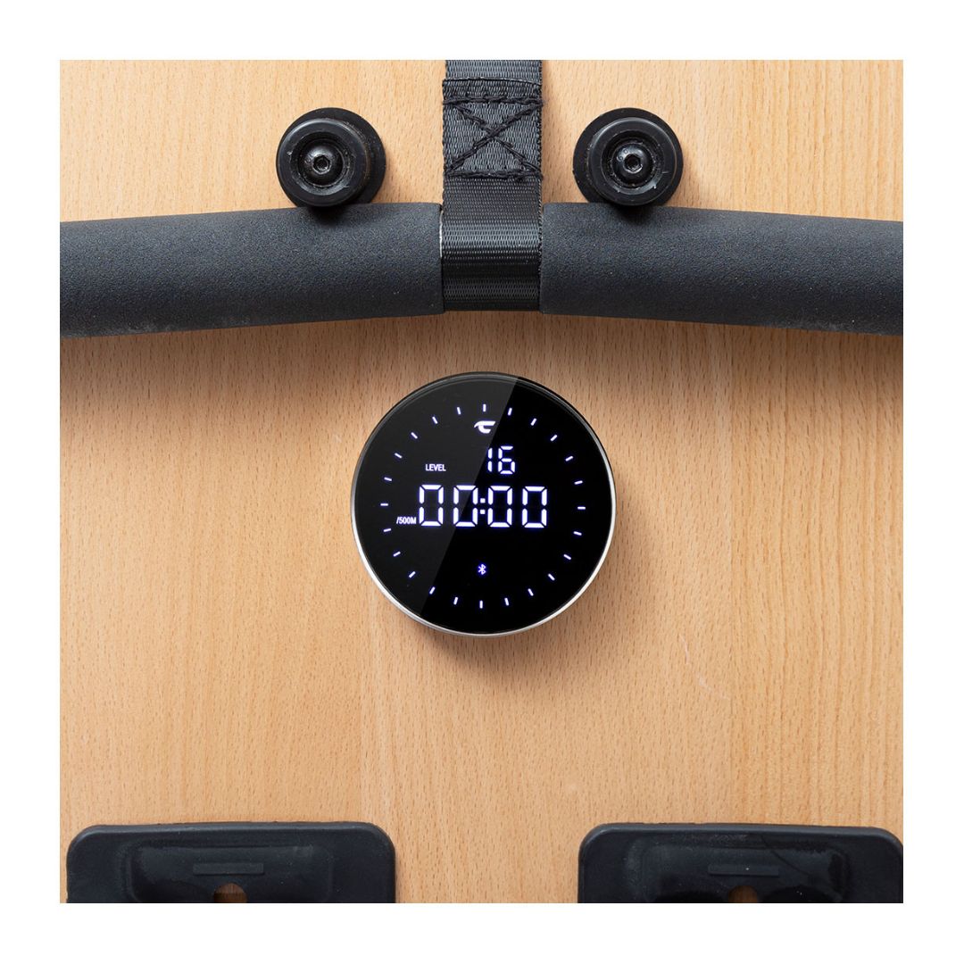 Mit der - aus massivem Buchenholz - stabil gestalteten Ruderzugmaschine, wird dank des innovativen Widerstandssystems aus einer Kombination von Wasser- und direkt verstellbarem Magnetwiderstand, ein authentisches und gelenkschonendes Rudertraining simuliert.