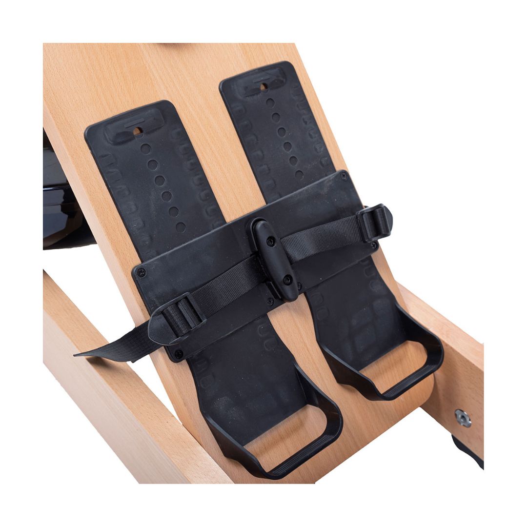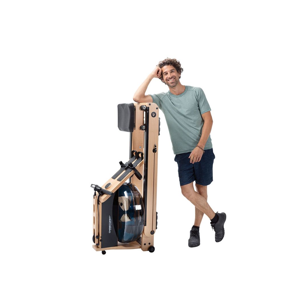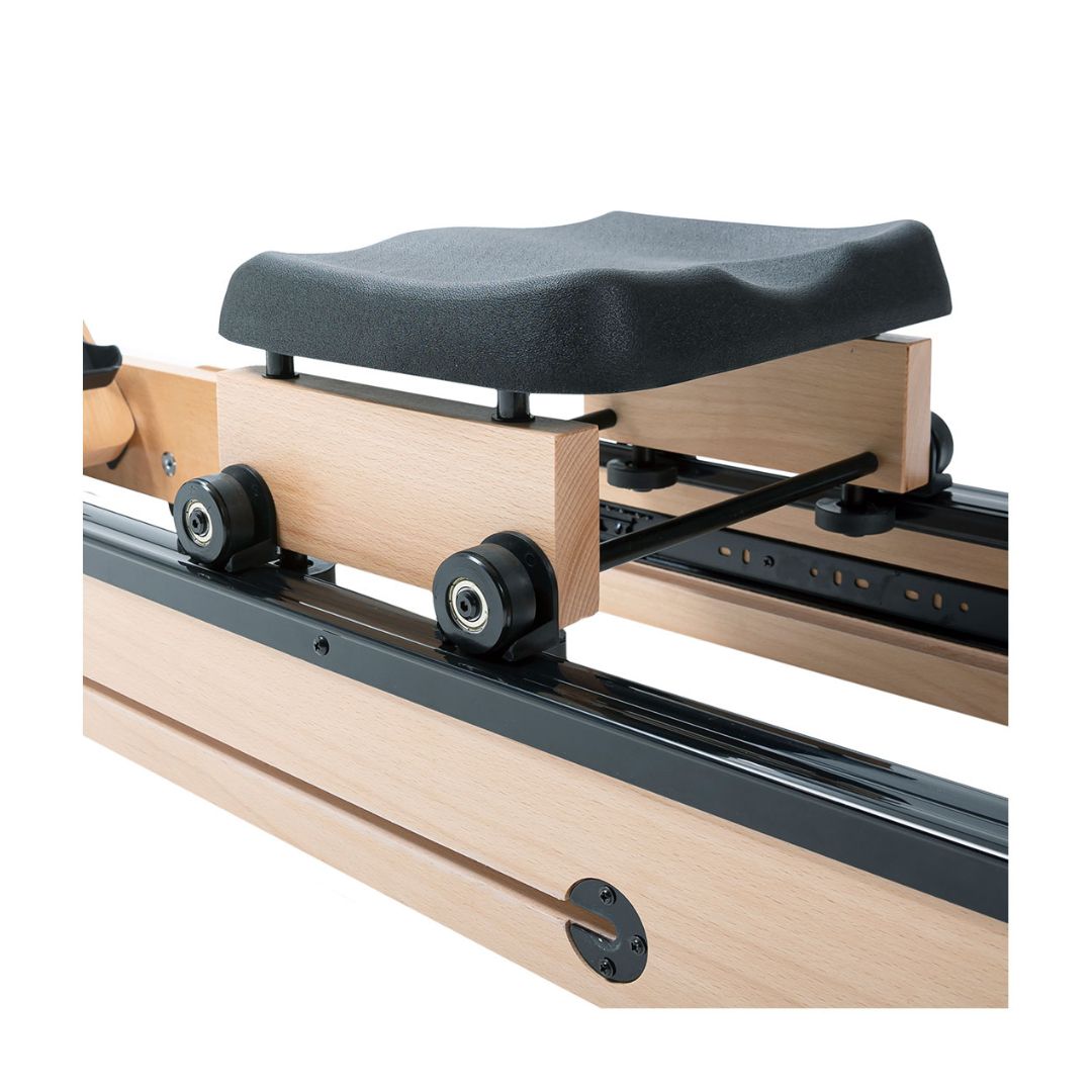 Mit der - aus massivem Buchenholz - stabil gestalteten Ruderzugmaschine, wird dank des innovativen Widerstandssystems aus einer Kombination von Wasser- und direkt verstellbarem Magnetwiderstand, ein authentisches und gelenkschonendes Rudertraining simuliert.